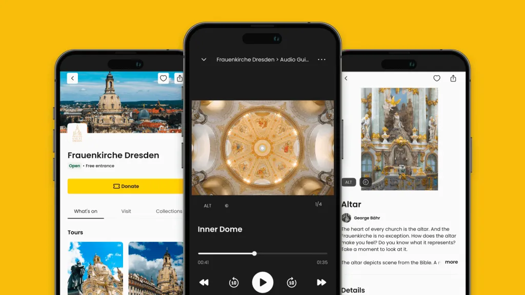 - Inviting contemplation: visitors often need a nudge to slow down, sit and reflect. Our guides include explicit invitations to do exactly this. Simple phrases like, “you’re welcome to sit here quietly,” or, “take a moment to look up at the stained glass window,” transform tourists into engaged visitors. Read how Frauenkirche Dresden used this approach.